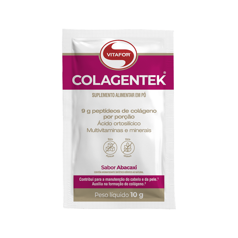 COLAGENTEK® É um suplemento alimentar em pó à base de peptídeos de colágeno, com zero adição de açúcares e enriquecido com vitaminas e minerais.