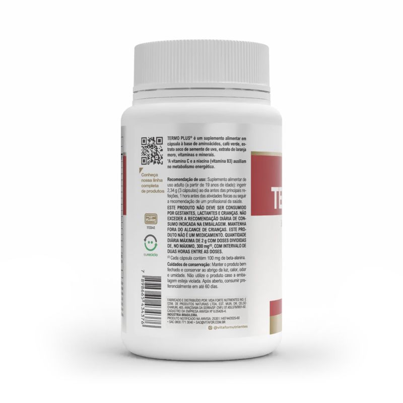 TERMO PLUS® é um suplemento alimentar à base de aminoácidos, café verde, extrato seco de semente de uva, extrato de laranja moro, vitaminas e minerais.